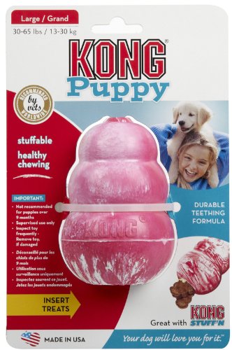 Puppy KONG's design, size and unique rubber formula provide all the benefits a growing puppy needs. Promotes healthy development of mouth and good chewing behavior. Soothes sore gums too. Use KONG Stuff'N Paste treats and paste to initiate play sessions. For puppies 2 to 9 months of age. Product Features: - Assists in teething - Aids in healthy development of your dogs' mouth - Promotes essential play - Encourages proper chewing habits - Soothes sore gums - Made in the USA Item Specifications Sizes: Small for dogs 1-20 lbs Medium for dogs 15-35 lbs Large for dogs 30-65 lbs Outgrowing Puppy KONG: Puppy Kong is uniquely formulated for puppy teeth and gums. When your puppy's adult teeth are (usually 6-9 months), discontinue use of Puppy KONG. At this age your puppy needs to be given toys that provide more exercise and resistence. Upsize to an adult strength red or black Kong.